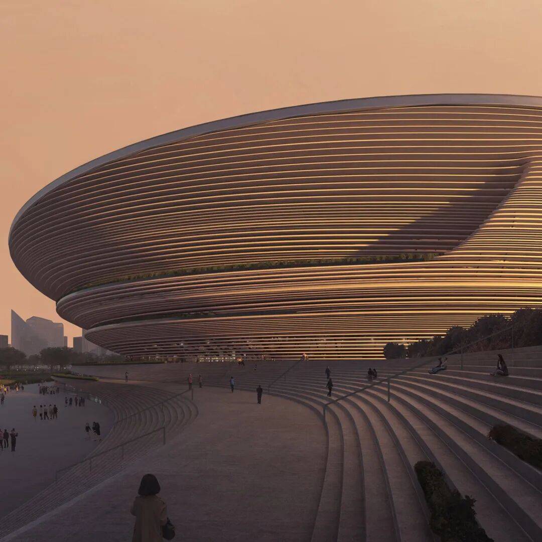 扎哈·哈迪德建筑事务所为杭州未来科技文化区设计了三座大型体育场馆,包括一座可容纳6万人的足球场。所有场馆将采用混合通风系统、地源热泵与光伏发电技术。足球场的座椅区将形成波浪形立面,并安装百叶窗。该设计既赋予建筑半透明质感,又能为百叶窗后方餐饮亭遮阳。