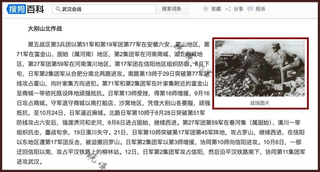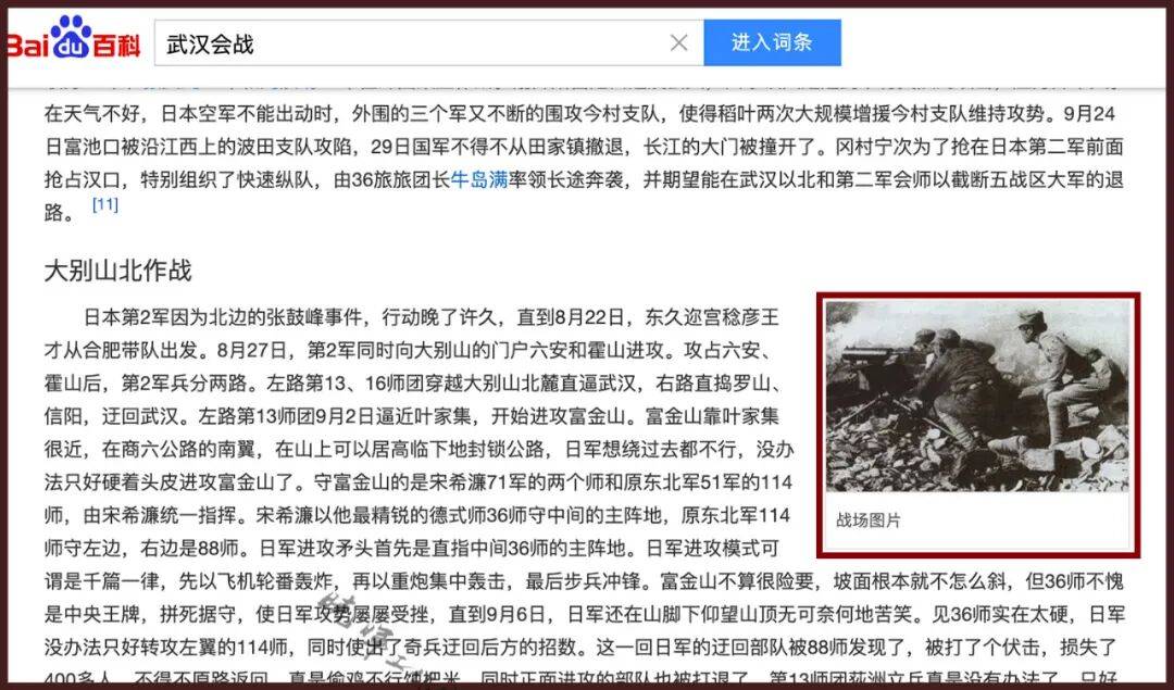 在国内的百度、搜狗等百科网站中,这张照片也随处可见,它多在武汉会战的大别山北作战条目中出现。大别山北作战即富金山战役。富金山位于河南,属大别山余脉。该战役中国军队成功抑制日军的攻势,但也付出了巨大的伤亡。