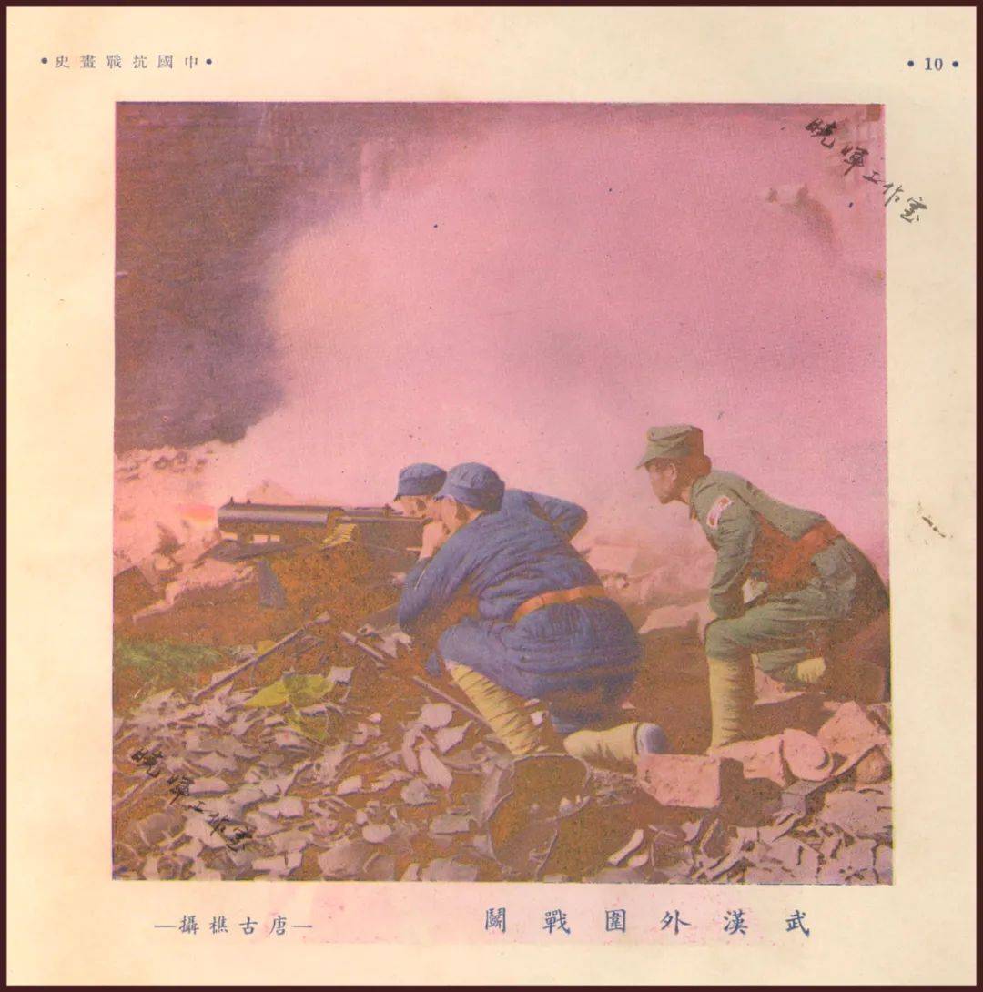 武汉外围战斗,应当指的是1938年6月至10月进行的武汉会战中的某个战役。翻到《中国抗战画史》的武汉会战章节,在205页有两幅照片,都是国军在残垣断壁中对外射击。