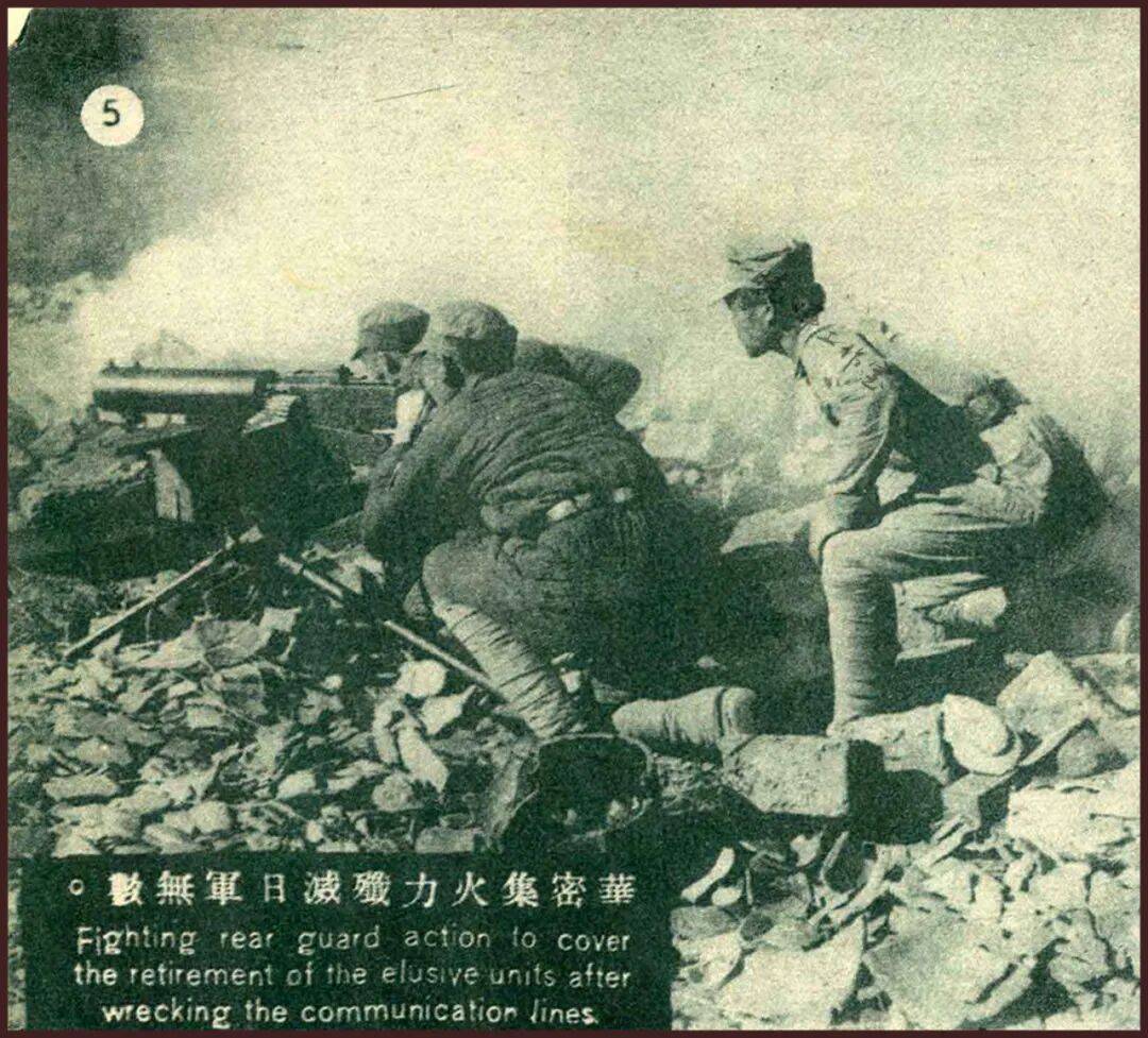 请注意,此处中英文的意思完全不同,中文说的是在歼灭敌人,而英文却说在打掩护。与《中国抗战画史》的封面不同的是,这张黑白照片中,重机枪的枪口没有喷火。